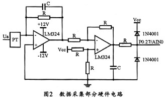 本系统中的数据采集电路由PT与CT、信号整理和A/D转换三部分组成,实时电流和电压经过PT、CT以及信号整理电路后,可变成0~3.3 V的模拟信号,然后经模拟转换电路完成数字化处理。数据采集部分的硬件电路如图2所示(6路采集电路中的一路Ua)。
