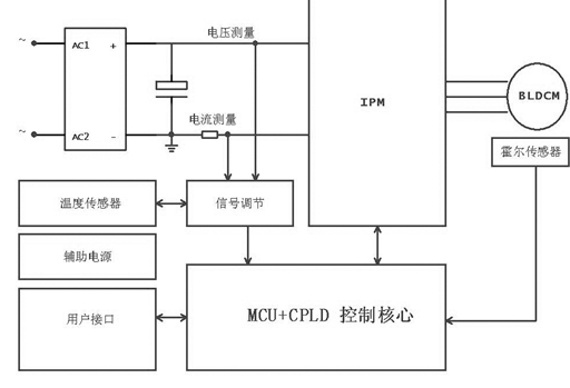 辅助电源将交流电源转化为+5/15V直流电源,提供给系统及智能功率模块使用;用户接口提供了一个驱动系统与操作者的沟通渠道,操作者通过它来调节电机的运行速度和方向,同时电机及驱动器的工作状态也通过它传递给操作者;霍尔传感器作为位置传感器,将无刷直流电动机转子的物理位置信息提供给控制核心;控制核心通过智能功率模块(IPM)将电力以合适的方式传递给电机,控制电机的运行方向和速度;系统同时也检测输入电压、电机的负载电流和驱动器的工作温度,获得电机的工作环境和工作状态,这些将参与电动机的控制并且在必要时将系统切换到保护状态,使系统有更高的可靠性。驱动器的设计将满足如下目标: