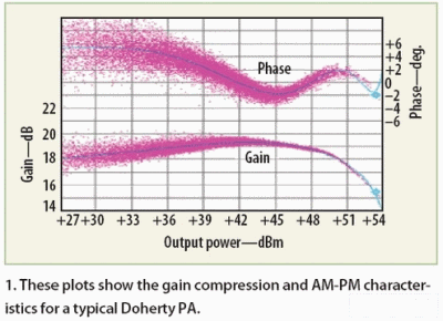 当前的DPD实现大多数采用无记忆线性化技术,其中采用瞬间非线性(预失真)来补偿PA的瞬间非线性行为。无记忆性功率放大器的特点是其幅度和相位传输特性,此特性一般指AM到AM(即增益压缩)和AM到PM特性。对这种无记忆性功放,可以采用一种通用查询表(LUT)做前置补偿器增益/相位校正。图1示意了一种典型Doherty PA的增益压缩和AM-PM特性。因为PA的增益和相位特性随温度、电压、元件老化而变化,要达到真正高效和有效的线性化,就需要自适应控制查询表。