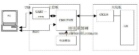 整个系统主要分成两部分(主控板和天线板),PC通过C8051FMCU RFID读卡器对相应的卡进行读写等操作,其中主控板的控制器用C8051F30X MCU,可通过USB 、RS232或RS485同PC端连接,CRX14是ST公司的非接触式射频读写芯片,用I2C总线与C8051F30X通信,实现对ISO14443 Type B协议非接触卡的读写控制。非接触式系统主要由读写器与非接触式记忆体标签组成,每一个标签读内含一个小型的记忆体晶片,可连接到小型线圈天线上。这个记忆体晶片可保存与其接触的产品项目之识别资料以及更新后的识别资料,而天线的作用则是透过射频功能将资料传送到记忆体晶片中,负责资料的输入与输出。