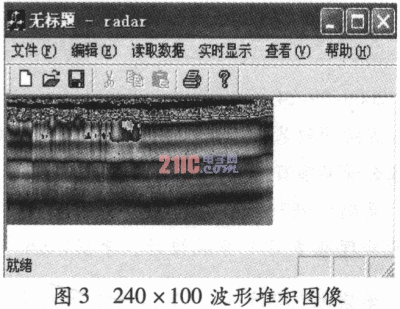 当得知地下有物体存在后,人们希望了解这个物体到底是什么,而利用上述波形的动态显示方法就难以给出结论。因此还需要通过这些回波产生一幅可视性强的图像,这通常建立在数字图像处理的基础上。通常称图2所示的波形为一维图像,如果能将其转化为二维图像,可视性会大为改善。这里用“波形堆积”一词来形容将一维图形转化为二维图形的过程。图3所示240个波形直接堆积的结果,这里采用灰度图像。