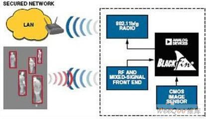 Blackfin处理器能够藉由序列或是平行介面与802.11晶片组连结。此外,由于这些处理器具有强大运算能力,因而能够支援split - MAC以及full - MAC 802.11 a/b/g的执行。举例来说,在对CompactFlash 802.11b卡进行系统整合时可能需要的full-MAC,是透过Blackfin的非同步记忆体埠来加以接合;而split-MAC的执行通常则是透过SPORT或是SPI介面来做接合─较低(lower)MAC会存在于无线晶片组上,而较高(upper)MAC则是在Blackfin的软体中执行。