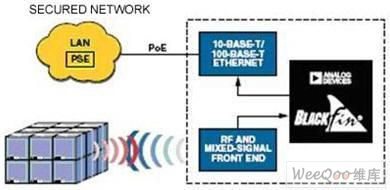乙太网路供电(PoE)网路是一种简化有线基础架构的方法,相当适合这类型的应用。在低功率应用方面,IEEE 80.3 a/f PoE可以应付连上网路的系统。如图4中所示,一组PoE系统会包含有供电设备(PSE)以及受电元件(PD)。PSE提供电源至乙太网路线,而PD(针对本文所讨论之目的而言)则由汇聚式网路处理器以及其周边的元件所构成。PoE的最大缆线长度建议值为100公尺,由于其具有相对的机动性以及可以省去传统的ac配线以及插座相关的成本,因而适用于许多嵌入式RFID应用领域。