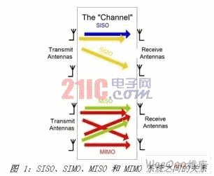 在无线通信系统中,在发射机和/或接收机上使用多个天线开辟了一个新的维度空间。如果能够正确利用这一技术,可以极大地提高性能,它现在被广泛地称为 MIMO(多路输入多路输出)系统。在术语 MIMO 中,“输入”和“输出”指的是无线信道。发射机的多个天线意味着有多个信号输入到无线信道中,接收机的多个天线是指有多个信号从无线信道输出。图 1 是对 SISO、SIMO、MISO 和 MIMO 系统的简单演示。通过本图,您可以很容易理解对于发射机天线(T)和接收机天线(R)的 MIMO 系统来说,如果每个发射接收天线对之间的信道独立进行衰落,则信道分集阶数为 T2R。