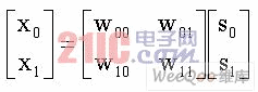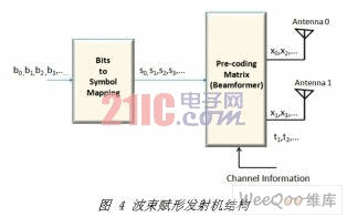 在空间分集和空间复用中,通常认为发射机不了解信道信息。当发射机具备信道信息时,可改善系统性能。信道信息可以是完整的也可以是部分的。完整的信道信息意味着发射机已知信道矩阵。部分信息可能指的是瞬时信道的某些参数(例如矩阵信道的条件数)或统计特性(例如发射或接收的相关特性)。图 4 显示了使用信道信息的预编码框架。发射信号(S0,S1)与预编码相乘,这可以解释为波束赋形。经过预编码之后,两个分离的数据流可从两个发射天线同时发送,作为空间复用,但是矩阵编码器将根据信道信息发生变化。假设发射机已经知道发射相关矩阵,则可以使用相关矩阵的特征矩阵建立预编码矩阵,以优化遍历容量。将 2 X 2 预编码矩阵表示为 W,则符码周期 t1 内的发射符码为: