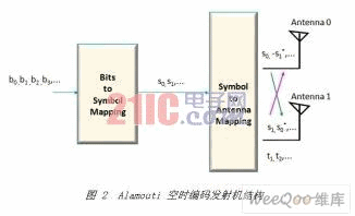图 2 给出了一个简单的发射机分集方案实例,也称为 Alamouti 空时编码。在指定的符码周期,两个天线同时发出两个信号。在符码周期 t1,分别从天线 0 和天线 1发送信号s0和s1,在下一个符码周期 t2 内, 天线 0发送信号 -s1*,天线 1发送信号 s0*,其中 ( )* 是复共轭运算。这一序列如图 2 所示。编码是在空时编码中完成的,也可在空频编码中完成。可使用两个相邻的载波(空频编码)来替代两个相邻的符码周期。使用 MIMO 信道的分集需要将上述发射和接收分集相结合。如果每个发射接收天线对之间的信道独立衰落,则分集顺序与发射和接收天线的数量相等。