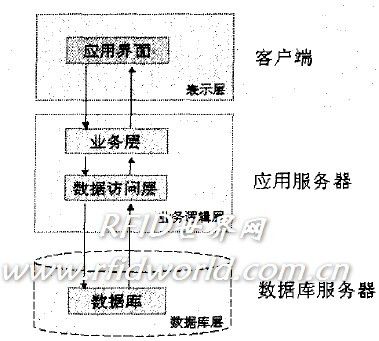 为了解决传统CIS的缺点,本系统在客户端和服务器之间加入了一层应用服务程序,这种程序称为“应用服务器”。将应用的业务逻辑放在中间层应用服务器上,与用户界面分开。在保证客户端功能的前提下,为用户提供一个简洁的界面。这意味着如果需要修改应用程序代码,只需要对中间层应用服务器进行修改,而不用修改成千上万的客户端应用程序。从而使我们可以专注于应用系统核心业务逻辑的分析、设计和开发,简化了应用系统的开发、更新和升级工作。本系统C/S部分的逻辑实现模型采用3层架构:表示层、业务逻辑层和数据层,如图2所示。图中的客户端、应用服务器和数据库服务器表示的是逻辑设备,并不表示物理机器,实际物理部署时,可以把它们部署在一台物理机器上。总体来说,客户端应用适用于局域网环境,客户机相对固定,应用安全性高,响应速度快,性能好。