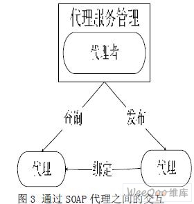 代理之间的通信如图3 所示,代理是通 过ACL 来交互的。在模型中,ACL 是由XML 协议所映射的。XML 的内容将会被送到 SOAP(Simple Object Access Protocol)[9],这是用来XML 编码用来交换信息。