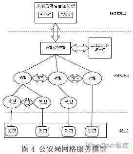 公安局网格管理系统就是利用网格的 各种技术将各部门的资源结合在一起,实现 快速、有效、方便的查询和管理各类资源。 因此根据前面对网格及多代理机制的描述, 将多代理技术应用于网格服务模型,并设计 出公安局网格服务模型,该模型框架如图4 所示: