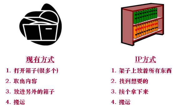 相较于传统的DS3传输方式,IP技术的优点在于灵活和高效率。打个比喻,DS3方式好像是使用很多只能放6个节目的箱子来进行搬运,而IP方式则是直接从架子上找着需要的东西就进行搬运,如下图所示: