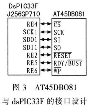 dsPIC33Fj256GP710内部集成30 KB的SRAM用作数据存储空间,256 KB的增强型Flash作为程序或数据存储区。由于微机保护,存储保护定值、事件记录和故障录波数据都需较大存储空间,因此该装置扩展1 MB的外部存储空间,将串行闪速存储器AT45DB081通过SPI总线同dsPIC33FJ256GP71O相连。AT45DB081的工作电压为2. 7~3.6 V,在系统重复擦写并兼容SPI的Flash存储器。内部有4 096页,每页264个字节,共计8MB的主存储器容量以及2个264字节的SRAM数据缓存器。AT45DB081与dsPIC33FJ256GP710的接口设计电路如图3所示。图3中dsPIC33Fj256GP710的SDO1、SOI1、SCK1分别与 AT45DB081的串行输入(SI)、串行输出(SO)和时钟(SCK)引脚相连,RE4,RE2,RE5,RE6分别与AT45DB081的片选 (CS)、复位(RESET)、忙闲状态(RDY/BUSY)和写保护(WP)引脚相连。dsPIC33F通过RE5读取AT45DB081的忙闲状态引脚判断存储器是否空闲,若RE5为“1”表示存储器空闲,否则表示存储器忙。当存储器空闲时,通过RE4引脚输出“0”作为存储器的片选信号,选中存储器后通过SPI发送命令字完成对AT45DB081的相应读写操作。微机保护需配置3个定值,且存储在不同的3个区间,运行时校验其定值是否正确。为此,对 AT45DB081的空间分配如下:定值、控制字、工厂设置和调节系数共分为4个区,存储在AT45DB081的第0~9页,即第一区为 AT45DB081的第0,1,2页,分别存储保护装置的第1,2,3个定值;第二区为AT45DB081的第3,4,5页,分别存储保护装置的第1, 2,3个定值;第三区为AT45DB081的第6,7,8页,分别存储保护装置的第1.2.3个定值;第4区为AT45DB081的第9页,存储调节系数。事件记录存储在AT45DB081的第10~1 000页。故障录波数据存储在AT45DB081的第1 001~4 000页。