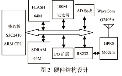 测试终端的硬件结构如图2所示。主处理器采用了三星ARM920T内核的S3C2410,该芯片非常适合开发高性能手持及便携式智能设备或终端。在本GPRSCQT测试终端中,着重有以下部分:
