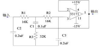 50Hz的工频干扰是数据采集系统中不可避免的,它会严重影响到前方和主放的稳定性。所以此处利用高性能器件MC33171构成50Hz陷波器,MC33171具有宽频带和较高的转换速率。图4为基于MC33171的50Hz陷波器电路,在图示的元件数值下,通过改变两个电阻R的值和一个电容C的值,可获得陷波频率,其数值为:f=1/4πRC。取R=16K,C=0.1μF可得陷波频率为50Hz。