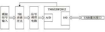 数据采集系统的结构框图如图1所示,主要包括DSP、前置放大电路、信号调理电路、USB通讯接口,由于三维感应测井有3个Z轴向接收线圈和7组三分量接收线圈构成,所以采用了7组多路开关。在一个数据采集系统中,A/D转换器是采集系统的核心。在基于TMS320F2812的数据采集系统中,选用了芯片嵌入式的ADC模块。