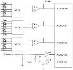 TMS320F2812芯片中集成了一个12位A/D转换模块。为了满足系统多传感器的需求,F2812的A/D转换模块有16个通道,可配置为两个8通道模块,这样就形成了两个A/D转换器。在内部逻辑的控制下,用户可同时启动这两个或是其中某一个A/D转换模块。