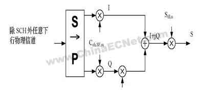 物理信道的扩频由两步组成。第一步是信道化,即将每个数据符号转化为多个码片, 以增加信号的带宽。每个数据符号内的码片数被称做扩频因子(SF);第二步为加扰,由此给扩频信号加扰。在下行链路中,两个连续符号组成的符号对经过串并变换,映射到I和Q支路上。映射的结果是偶数号和奇数号的符号分别映射到I和Q支路上。I 和 Q 支路由相同的实值信道化码Cch,SF,m扩频到码片速率,然后将I和Q支路上实值的码片序列变换成复值码片序列。该序列由复值的扰码Sdl,n加扰(复数相乘)。具体的扩频加扰框图(如图2所示)。