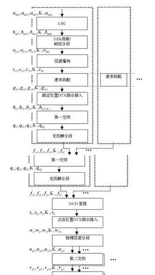 首先将各传输信道的一个发送时间间隔(TTI)内的输入数据划分成各传输块,并在每块末尾加上CRC校验比特位,以便收端进行差错检测。