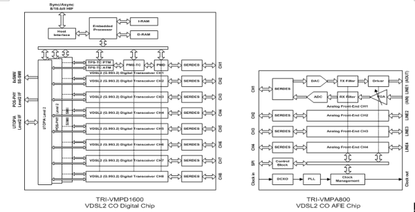 8端口VDSL2 CO套片由一颗8端口数字芯片TRI-VMPD1600和两颗各4端口的模拟前后端芯片TRI-VMPA800构成,它们可以同时支持包括30a在内的VDSL2所有8个传输模板,并且和主流VDSL2 CPE芯片以及ADSL2、ADSL2+芯片实现了互联互通和反向兼容。