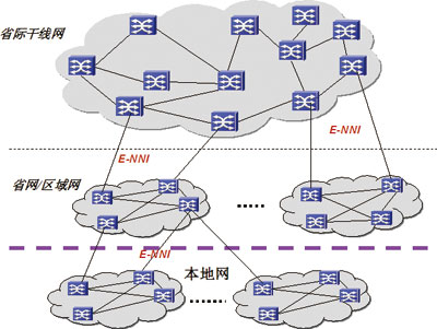 省际ASON网除了包括现有的省会节点外,还可以将国际出口节点、省内网的第二出口点、业务需求较大的部分沿海发达城市纳入,进行统一的调度管理。各层ASON网络独立组织控制域,各层网络之间通过E-NNI进行互连,以实现跨层的端到端调度。
