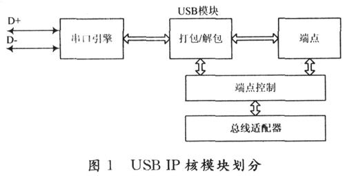 USB IP核主要是实现了USBl.1协议,在对整个协议分析的基础上,整个IP核共分成五大模块:串行接口引擎模块、协议层模块、端点控制模块、端点存储模块和总线适配器模块。串行接口引擎主要是支持最底层的USB协议,由于USB协议中为了增加抗干扰对比特流进行了“不归零码(Non Return to Zero Invert)”的编解码,同时为了可以从比特流中提取同步信号用了“位填充”和“位剔去”。串行接口主要完成比特流方面的处理。协议层模块则主要是完成解包和打包。在USB协议中,数据缓冲区用了端点(Endpoint)这个概念,不同的缓冲区用了不同的端点号来区分,端点存储模块就是相应的数据缓冲区。端点控制模块主要是端点控制寄存器和端点状态寄存器,对端点进行相应的控制。总线适配器模块主要是在不同总线结构的SoC中,对USB IP核总线接口进行相应的配置,从而可以进行无缝连接到相应的SoC中。USB IP核模块划分如图1所示。