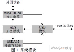 该系统由两大模块组成:USB 模块和AES 加密模块。 系统结构如图1 所示: