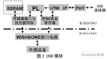 其中,USB 模块实现流经数据依照USB2.0 规范进行接收和发送。将要发送的数据进行装配、 打包处理,并对接收到的数据包进行分解,在存储器接口与优先级判别模块的处理之后将数 据存入外部存储器 (SSRAM)或通过WISHBONE 接口电路与外围设备进行通讯;AES 加密 模块负责对接收到的数据进行加密处理,密钥封装在芯片中的存储器中。