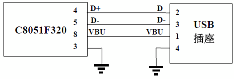 所示的整个模块的供电电源都来自外部5V 电源。C8051F320 中的USB 收发器内部已经集成了上拉电阻,不需要任何外部器件就可直接与USB 接口相连。