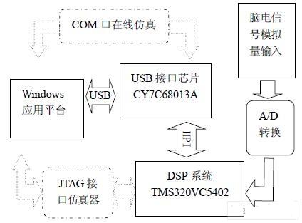 系统的核心为TMS320VC5402,有三个功能:首先,控制整个系统模数转换并设置各种模拟部分的参数;其次,对A/D变换后的数据进行各种算法处理,包括信号滤波与分析等,也是高性能脑电数字信号采集器的重点;最后完成数据接口功能,把数据按一定的格式打包,通过高速的HPI总线把数据交给USB接口芯片并送往PC机。图(1)为整个方案的原理图,其中虚线部分为调试过程示意图。调试过程中,通过集成开发环境KEIL C51和CCS 5000系统,可视化的调试过程有利于整个方案的后期调试。
