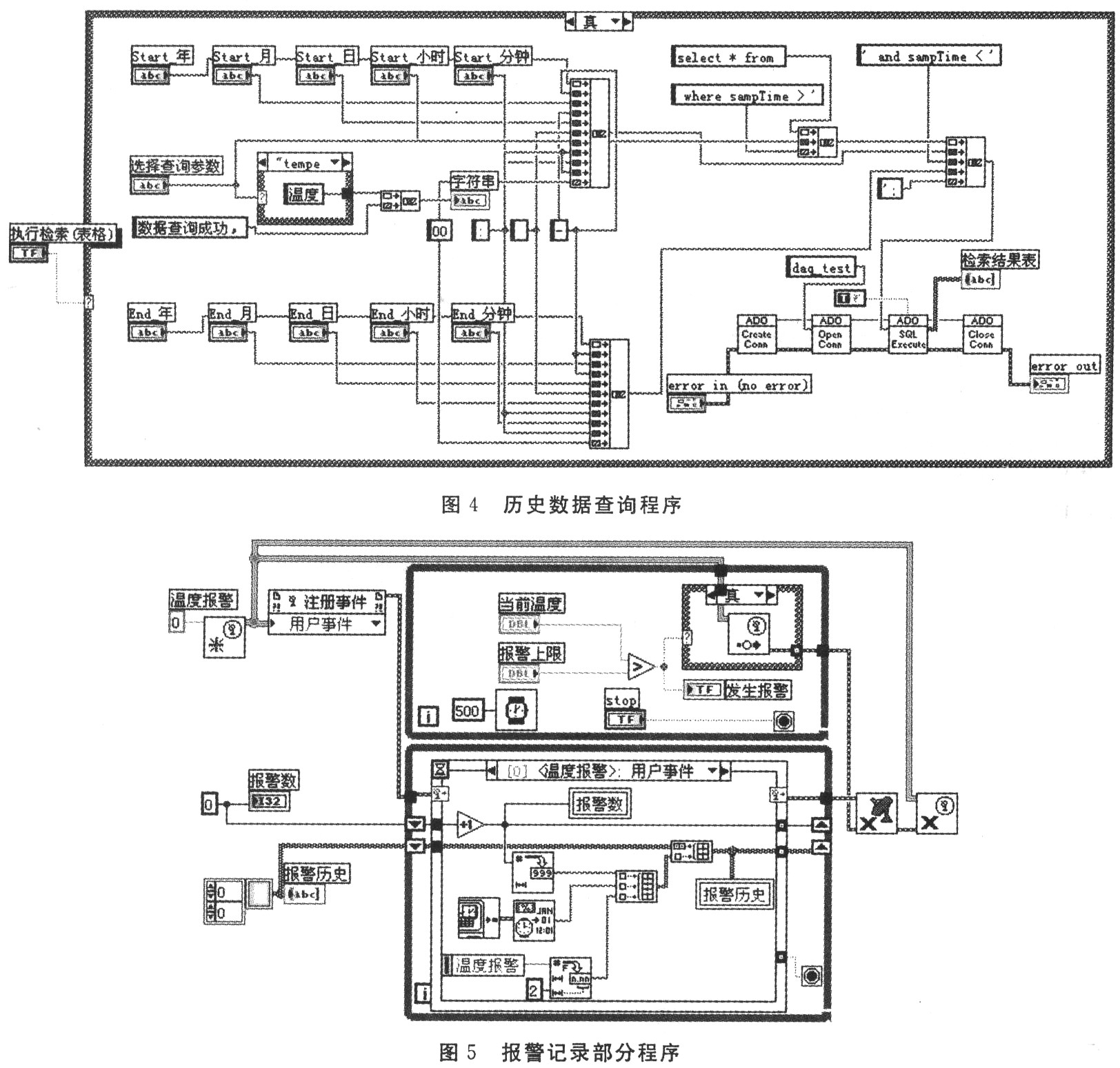 历史数据查询,因为已经把采集的数据保存在数据库里了.所以历史数据的查询只需要从数据库里按照一定的条件检索出来就行了,这样就涉及到检索条件的问题,而保存数据的表格的主键已设为保存时刻.每个数据在时间上是唯一的。因此检索条件确定为保存数据的时间段。具体程序见图4。