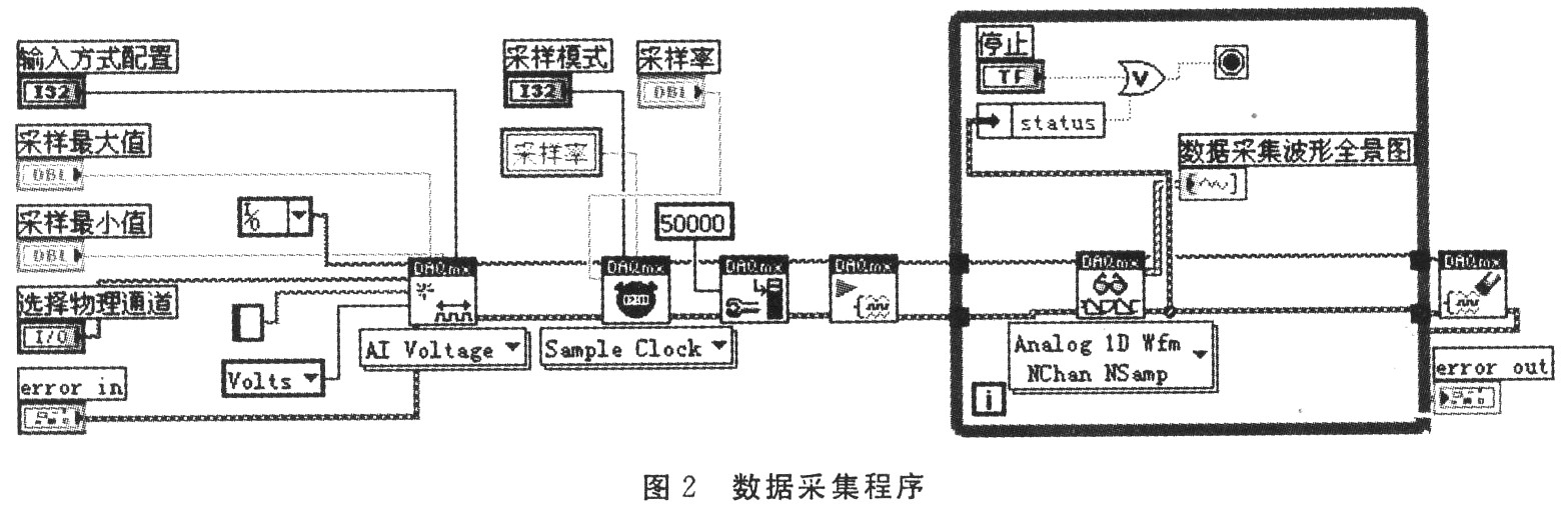 系统采用的是NI PCI-622l采集卡,由于该卡支持DAQmx驱动程序,所以本设计是直接使用DAQmx-DataAcquisition开发的,在这部分中.主要是采集参数的设置,其中包括物理通道的选择,采样模式、采样率、每通道采样数、输入方式的配置,采样最大最小值的设置。具体程序见图2。