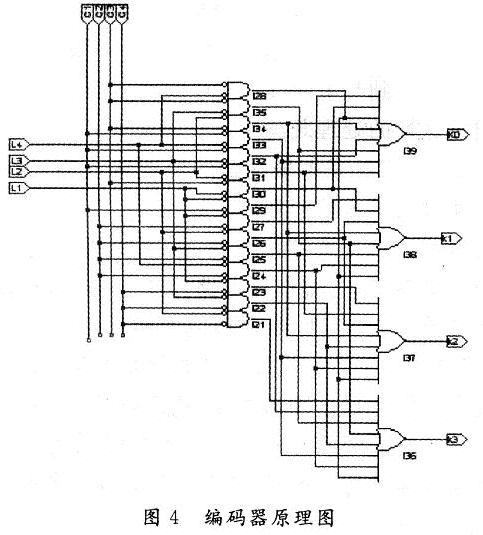 (2)该设计中采用4×4的键盘,有16个按键状态,再加上一个没有键按下的状态共有17个状态,而4位二进制数只能表示16个状态。为了解决这个问题,将R4和L4或非后再与计数器产生的中断信号相或,产生一个单片机中断。当按下最后一个键时,键盘控制器便产生1个中断,让单片机来读取这个按键值0000(在没有键按下时也是这个状态),从而区分了无按键状态和最后一个按键按下的状态。这样在编码的时候只需考虑前15个键的状态信息。最终可用4位二进制数表示所有按键状态。图4给出实现编码器的具体原理图。