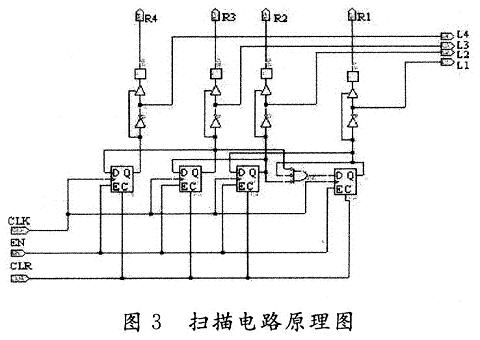 通过这样的处理既满足设计的需要,又起到对器件保护的作用。EN是扫描电路的使能输入端,高电平有效。它通过去抖动后的列回复线相与得到。当有按键按下时,相应的列线将被置低。相与的结果为低,这使扫描电路停止扫描,等待控制器对扫描结果进行处理,得到相应的键值送入键值锁存器,等待单片机读取。这样做的好处是可防止控制器漏掉按键的读取。根据调试得知,键盘扫描时钟信号最好是去抖电路时钟的四分频以上。所以CLK是通过对去抖电路的时钟进行分频得到的。图3给出实现扫描电路的具体原理图。