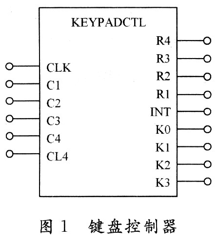 根据键盘的扫描原理,键盘控制器的输出引脚R1~R4(行扫描线)依次循环输出低电平,并将相应的键盘行置低。当有按键按下时,相应的输入c1~c4(列回复线)也被置低。然后根据行和列的低电平对应关系就可以通过编码确定按下的键值。输出K0~K3就是最终等待单片机读取的键值。INT输出单片机的中断信号,通知单片机来读取键值。CLK是控制器的时钟信号,cLR是控制器的清零复位信号。