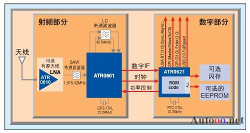 GPS RF接收器IC具有优良的RF性能和小于6.8dB的噪声系数,对干扰不敏感,功耗小于40mW。它包括一个频率合成器、带自动增益控制(AGC)的中频放大器和1.5比特的A/D转转器,采用了BiCMOS工艺制造,接收器支持XTO和TXCO。外部必须使用一个SAW带通滤波器和一个分立的IF滤波器(96.764 MHz)连接到RF接收器。 GPS基带处理器ATR0621包括一个16通道GPS相关器,该基带处理器基于ARM7TDMI处理器内核。它有128kB的内部SRAM和384kB内部ROM,在这个ROM中包括全部的GPS固件,由u-blox公司授权,用来执行基本的GPS处理,包括跟踪、获取、导航和定位数据输出。对于普通的PVT(位置/速度/时间)应用,不需要片外闪存或ROM。固件支持在可选的外部EEPROM中存储可能的配置设置,对于特定的用户应用提供一套软件开发套件。基带具有不同的接口以方便灵活的系统集成(2个USART、USB 2.0、SPI、GPIO),而且通过不同的省电模式提供先进的功率管理。导航的结果通过USART或者USB接口输出,使用内部NMEA(0183)协议或者u-blox公司的协议,后者具有增强的导航信息和控制功能。