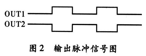 时钟电路采用80 MHz有源晶振,它为系统提供时钟信号;锁存器1及锁存器2用于保存频率及占空比数据,为16位计数器提供预置值,锁存器位数为8位,设定的数据通过工控机输入,由于计数器位数为16位,故需分两次打人数据;计数器1及计数器2作为定时器,按锁存器1、2设定的值计时,两个计数器交替工作,即一个计数器工作而另一个计数器不工作。当工作的计数器到达计时时间后,向控制电路发出时间到信号。控制电路接收计数器发出的信号,停止计数器工作,并重新装载计时数据,同时启动另一个计数器工作,从而产生规定频率、占空比的脉冲信号,并输出两路脉冲信号,如图2所示。为了提高信号源带负载能力,输出使用了7417367驱动芯片增加驱动电流。
