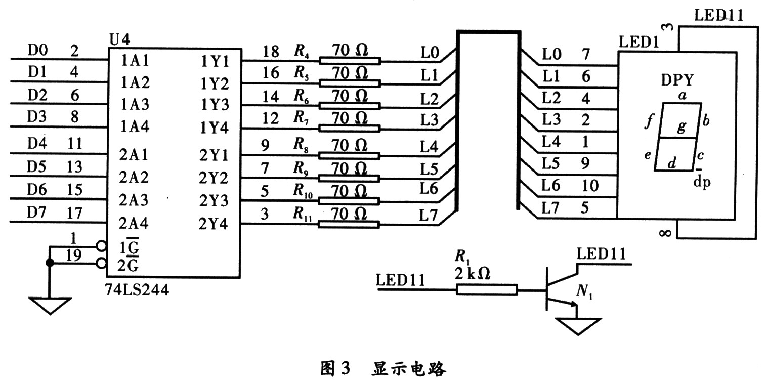 显示电路图,如图4所示,其中需要显示的数据代码通过工控机输入。缓冲器74LS244用做多路开关,当选通信号有效时,该路锁存数据有效,数码管显示相应的数据。