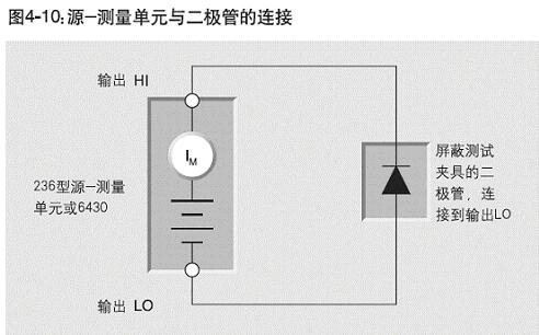 图4-10 示出如何使用236型或6430型SMU来测量二极管的泄漏电流。236型SMU能够以10fA的分辨率测量电流,并且输出需要的偏置电压。6430型SMU的分辨率为10aA。源-测量单元还可以测量其它的二极管参数,包括正向电压降和击穿电压。