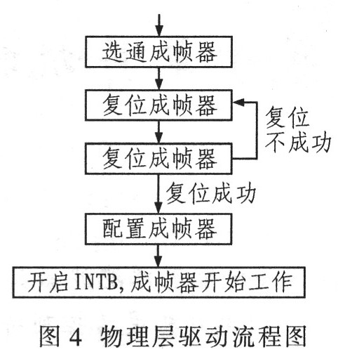 物理层通过地址总线映射配置成帧器,其中PCI桥设备和成帧器之间经过CPLD控制选通。物理层驱动完成配置成帧器、复位控制等。成帧器是将E1上的比特流整合成符合规范的HDLC帧,其中一个标准HDLC帧包括32个时隙,这些时隙可配置映射到HDLC控制器的端口信道,实现2 M、N×64 K、N×8 K高速模式。其配置流程如图4所示。