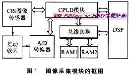CPLD是图像采集的核心部分,它直接控制CIS图像传感器和A/D转换器,完成数字图像数据采集、转换和存储,以及与DSP处理器的握手协调。
