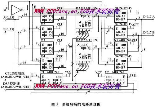 图3中,RAM1和RAM2为2片IS61C1024,构成双数据缓冲存储区,M1-M4分别是由74HC16245所构成的,实现地址总线切换控制,N1-N4是由74HC245所实现的数据总线切换控制,C1和C2实现了存储器控制线(RD读信号、WR写信号等)的切换控制,当选择线E为高电平时,M1、M4、N1、N3及C1处于工作状态,而M2、M3、N2、N4及C2处于高阻状态。因此RAM1的数据总线、地址总线及控制总线只有总线与CPLD相连接,RAM2的全部总线与DSP相连接。从而实现由CPLD向RAM1写数据,DSP从RAM2读数据,当选择线E为低电平时,则情况相反,DSP从RAM1读数据,CPLD向RAM2写数据。