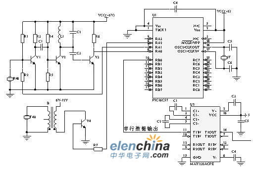 距离值通过PIC16C57的10脚进行串行输出,经MAX232芯片后与ARM的串口相连。芯片MAX232是为RS232标准串口设计的接口电路,它完成TTL电平和RS232电平的转换[8]。