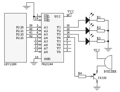 设计中,分别采用了LPC2290的P2.20(GPIOA4)驱动绿色LED,P2.21(GPIOA5)驱动黄色LED, P2.22(GPIOA6)驱动红色LED,P2.23(GPIOA7)驱动蜂鸣器。所设计的报警电路如图3所示。