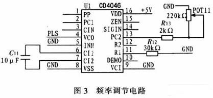 图3为频率调节电路。通过调节CD4046外接电位器POTll,控制VCO输出脉冲的频率,根据设计要求,该电路将输出一个变化范围在1~6 kHz之间的脉冲信号PLS,将该信号作为CPLD的输入信号。在CPLD内部通过计数延时和占空比设计要求,最终输出一个频率在400~3 000 Hz之间符合占空比要求的逆变触发信号,并可通过POT11调节该信号的频率。