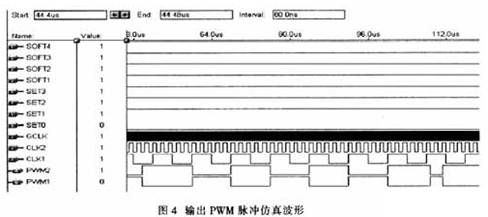 该系统软件设计是根据系统功能要求而设计的,基于EPM7128的软件程序设计分为:输出脉冲占空比调节、频率调节、软启动时间调节和过压过流报警。开发系统使用VHDL语言进行模块化编程,这样可以提高程序的移植性,缩短开发周期,降低开发成本。而且易于维护系统软件,提高可靠性。图4是输出的两路PWM脉冲仿真波形,其中GCLK是一个基准时钟源,CLKl和CLK2分别是经VCO转换的频率调节和占空比调节信号,SET和SOFT分别是2个外接的4位占空比调节和软启动调节拨段开关。