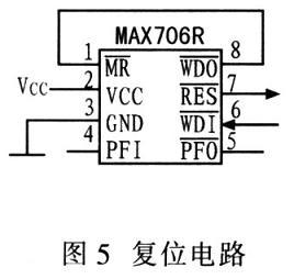 图5为MAX706R实现的复位电路。而时钟电路使用TMS320VC5402内部振荡器,在其X1和X2/CLKIN引脚之间接一个晶体,用于启动内部振荡器。