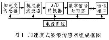 图1为加速度式波浪传感器的系统组成框图,该框图包括加速度传感器、抗混叠滤波器、A/D转换器、数字信号处理器、通讯接口、电源系统等部分。