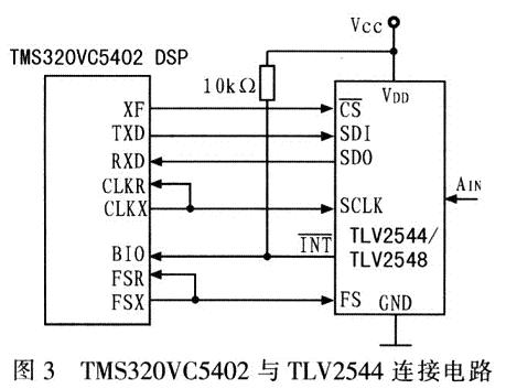 数字信号处理器TMS320VC5402提供高速、双向、多通道带缓冲串行端口McBSP,可与串行A/D转换器直接连接。每个BSP口工作在SPI方式和I/O方式。在SPI方式下,BSP口便于与遵循SPITM协议的串行设备相连。TMS320VC5402与TLV2544接口时,该器件作为SPI主设备向TLV2544提供串行时钟、命令和片选信号,实现无缝连接,无需附加逻辑电路,其连接电路如罔3所示。