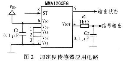 加速度传感器是波浪传感器的核心部件,这里选用Freescale开云棋牌官网在线客服公司生产的MMA1260EG型加速度传感器。该器件是一款低成本、小尺寸、硅电容式微机械加速度传感器,采用信号调理、温度补偿和自检等技术。该器件已进行零g补偿和双极低通滤波等处理,从而简化了外嗣电路设计。MMA1260EG 的工作电压为5 V,测量范围为Z轴±1.5 g,灵敏度为1 200 mV/g。图2为MMA1260EG的应用电路。