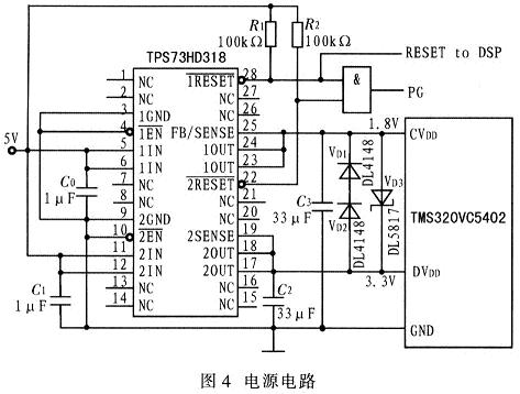 TMS320VC5402是TI公司生产的性价比极高的16 bit定点数字信号处理器(DSP),操作速率可达100 MI/s,内部资源配置大大方便用户构造系统。TMS320VC5402配置有4 K×l6bit片内屏蔽式ROM(F000h~FFFFh)和16 K×l6 bit双存取的RAM(DARAM),其中4 K ROM中包含Bootloader程序。用户自行设计时,如程序容量不超过16 K,可利用器件内部资源。采用引导装载方式,以降低系统设计难度和成本,加快设计进程。DSP的硬件基本电路包括电源电路、复位电路、时钟电路等。其中电源电路用双电源供电,内核电源CVDD采用1.8 V,I/O电源DVDD采用3.3 V。该电源电路由TPS73HD318实现,如图4所示。