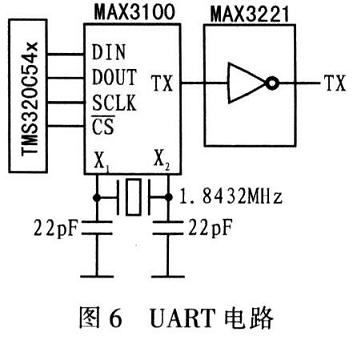 通讯接口是通过SPI总线扩展,选用Maxim公司的MAX3100。MAX3100内置1个简单的UART,带SPI接口的波特率发生器和1个中断发生器,通过“写结构寄存器”设定波特率、字长、校验、8字节接收FIFO,选择通用UART或Ir-DA,控制关闭状态和4个中断任务。图6为UART电路,图中MAX3221为电平转换器。